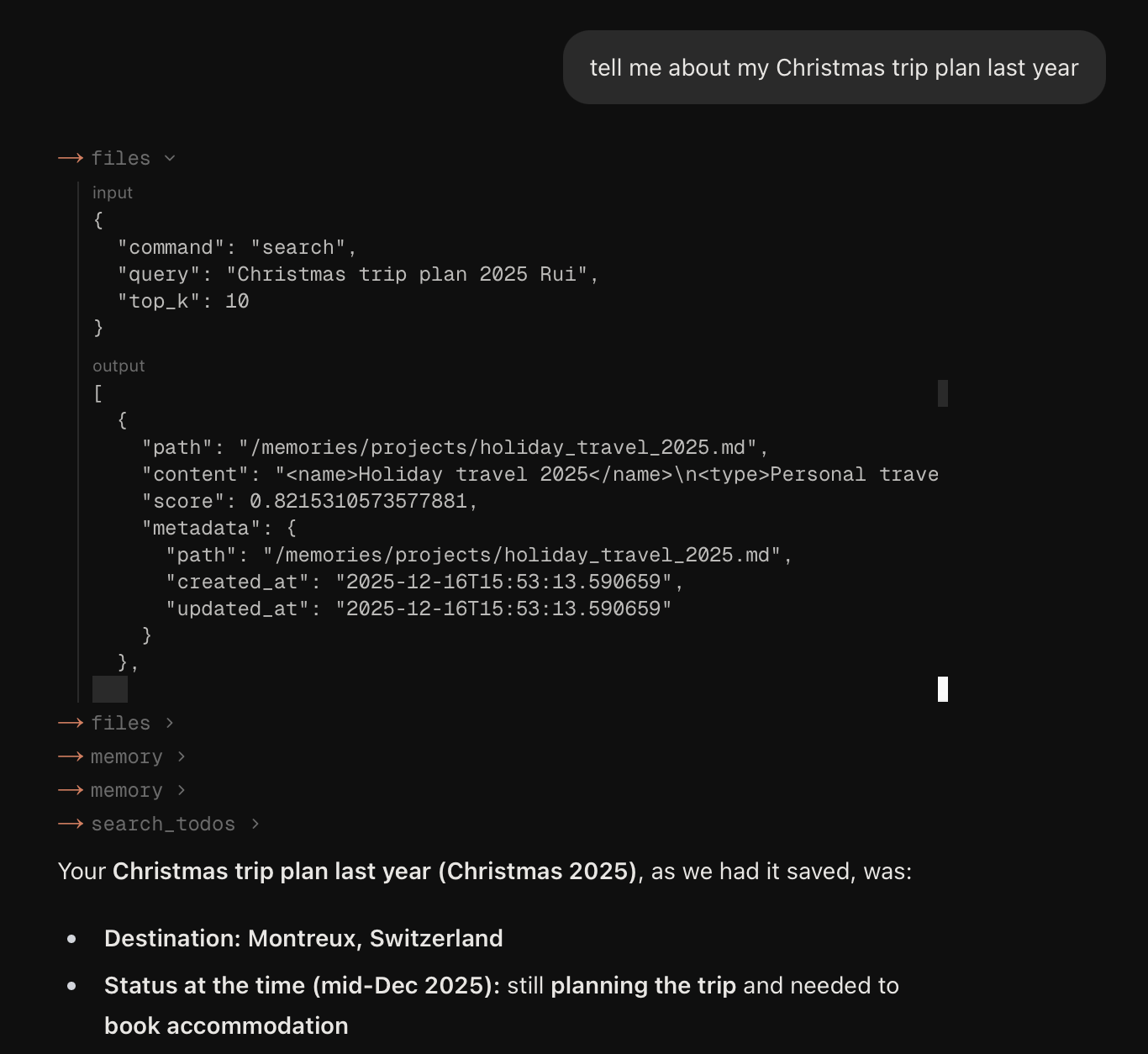 /memories/user.md- User profile loaded into system prompt (preferences, name, role)/memories/people/- Information about contacts (details about Alice, Bob)/chats/- Conversation summaries by date (key decisions, action items)/notes/- User-created documents (project ideas, meeting notes)/todos/- Task items and reminders (pending tasks with due dates)
